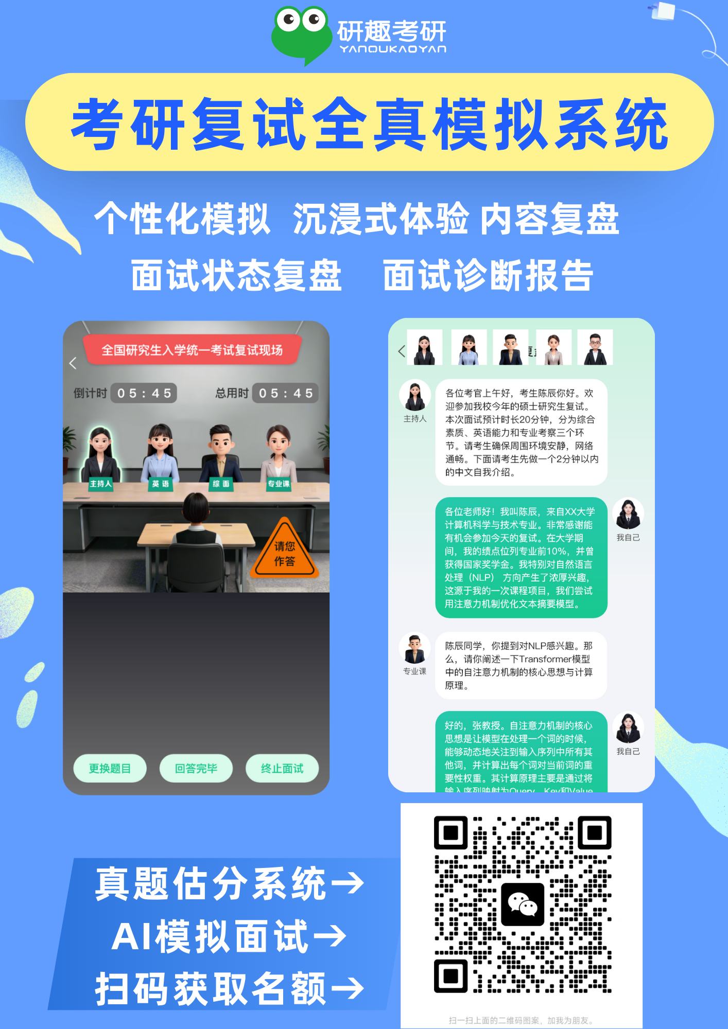 考研复试竞争日趋激烈,盲目刷题、泛泛练习早已无法满足提分需求。考生的本科基础不同、目标院校的考察重点各异,想要在众多竞争者中脱颖而出,必须要有针对性的备考方案。研趣考研 AI 复试模拟系统直击核心痛点,以 “个性化 + 专业化” 为核心,为每位考生量身打造高效复试备考路径,让提分过程清晰可见,告别低效内耗。