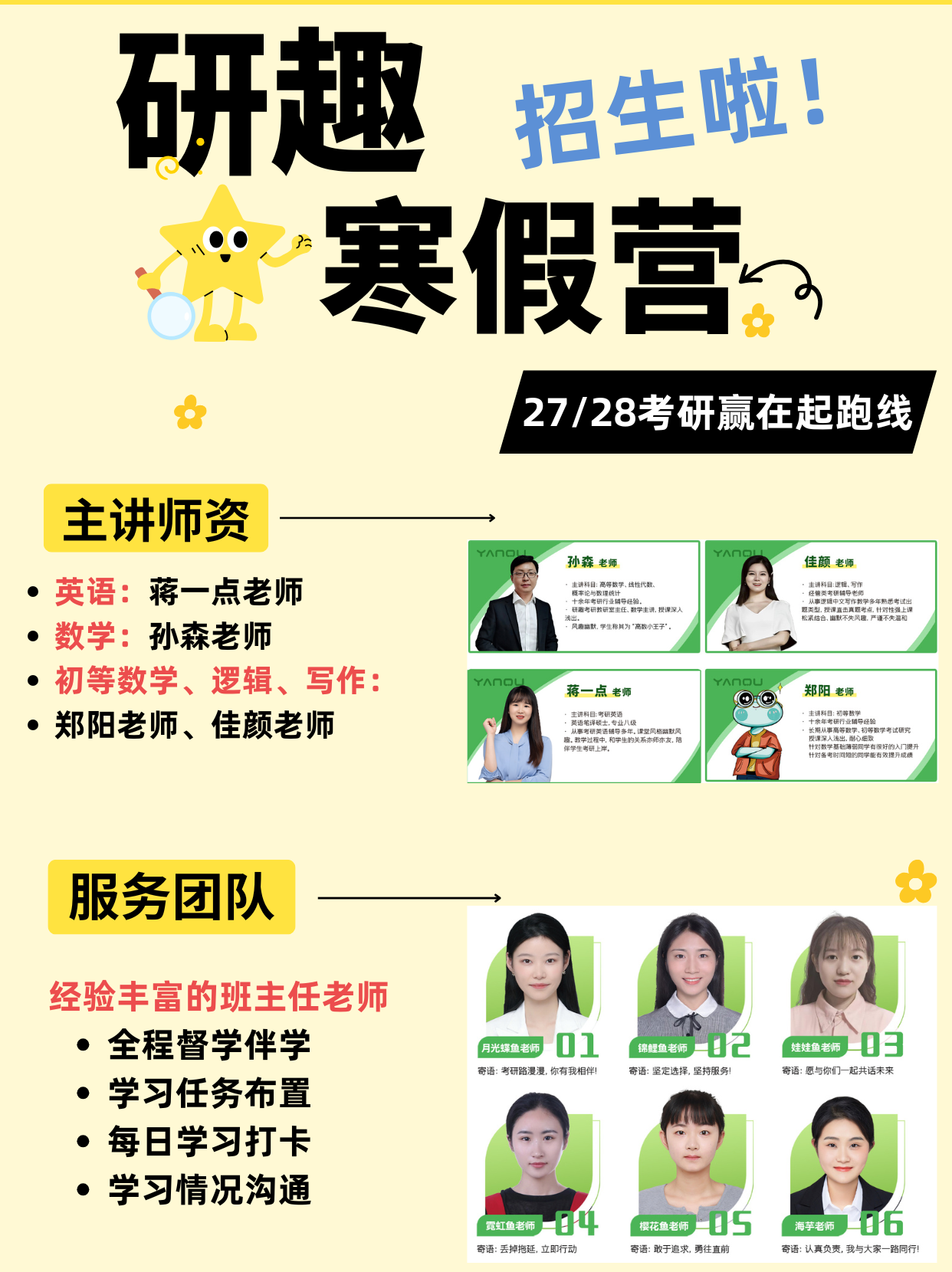 研趣考研的寒假集训营主要开设英语和高等数学两大核心课程,同时附带初等数学和逻辑与写作等课程。