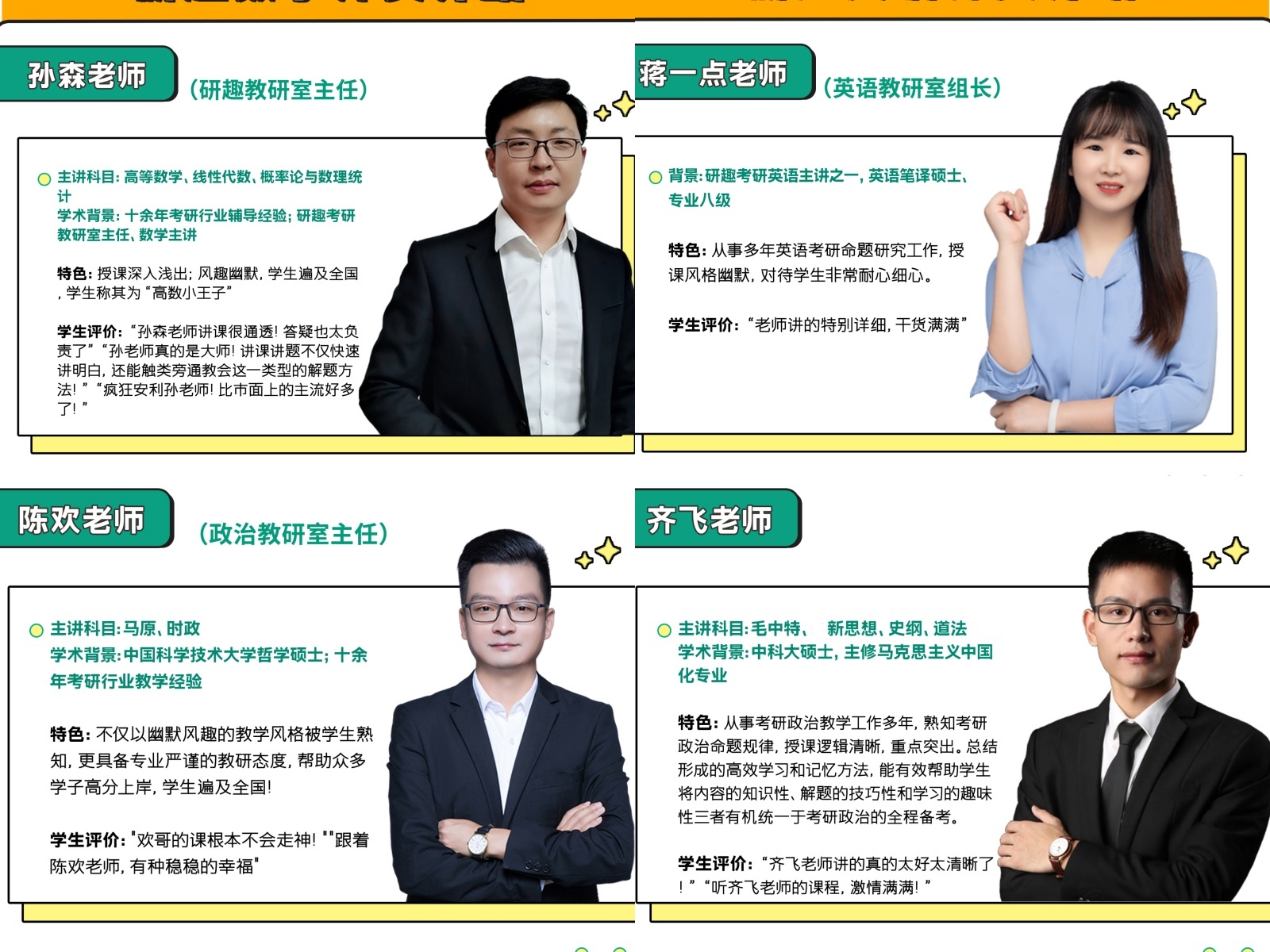 研趣集训营的核心优势之一,在于其强大的师资团队。教研团队平均拥有8年以上行业经验,教研室主任更具备14年考研教学经验,深耕考研辅导领域,对考点趋势、命题规律了如指掌。