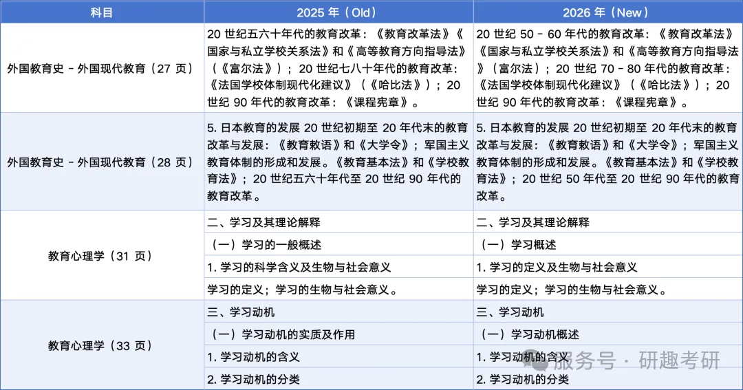 外国教育史2处写法变化,教育心理学2处内容变化,其他无变化。