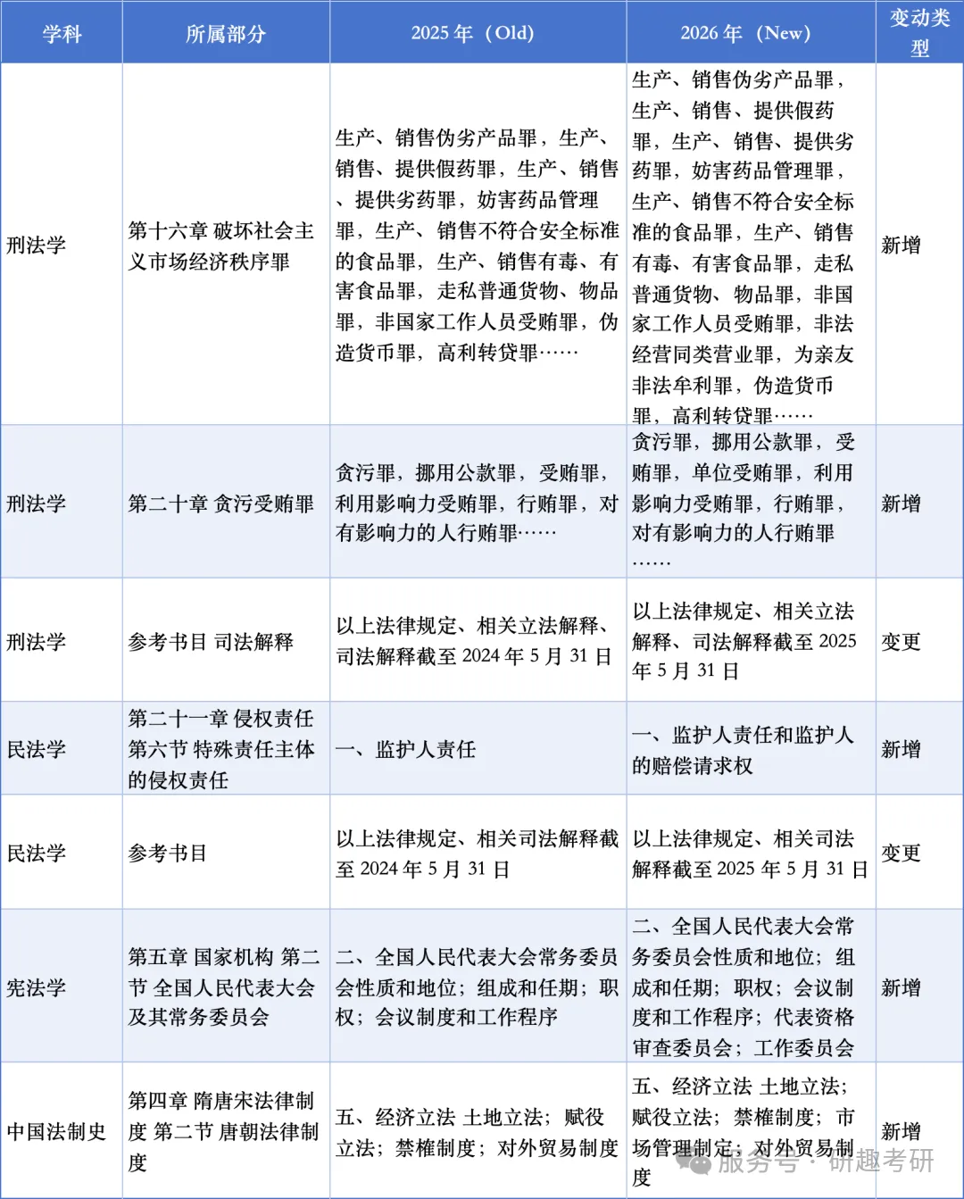 刑法学2新增1变更,民法学1新增1变更,宪法学2新增,中国法制史1新增,其他方面无变化。